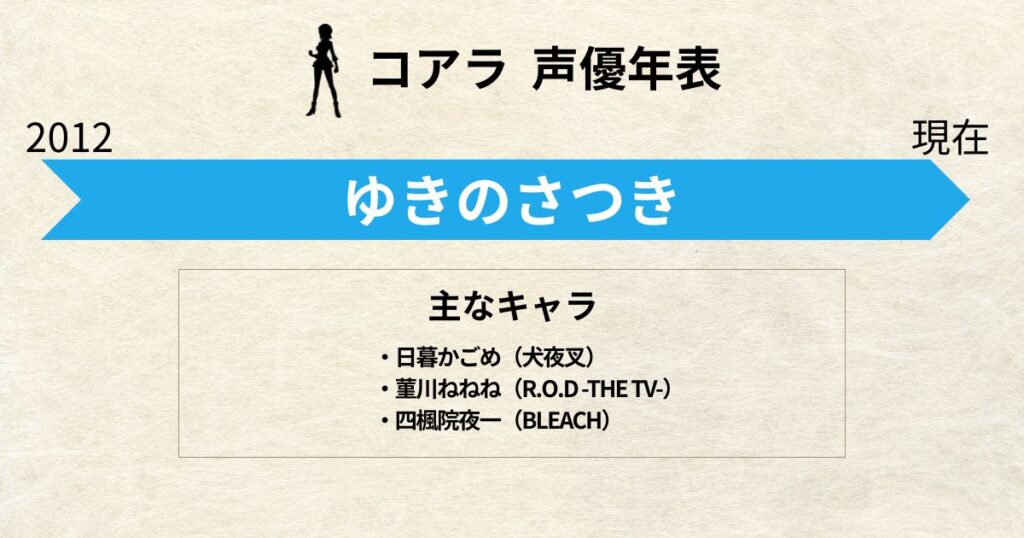 ゆきのさんは、凛とした女性から元気な少女まで幅広い演技が魅力で、特に「犬夜叉」の日暮かごめ役で多くのファンに知られています。